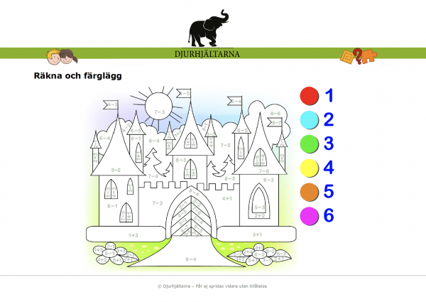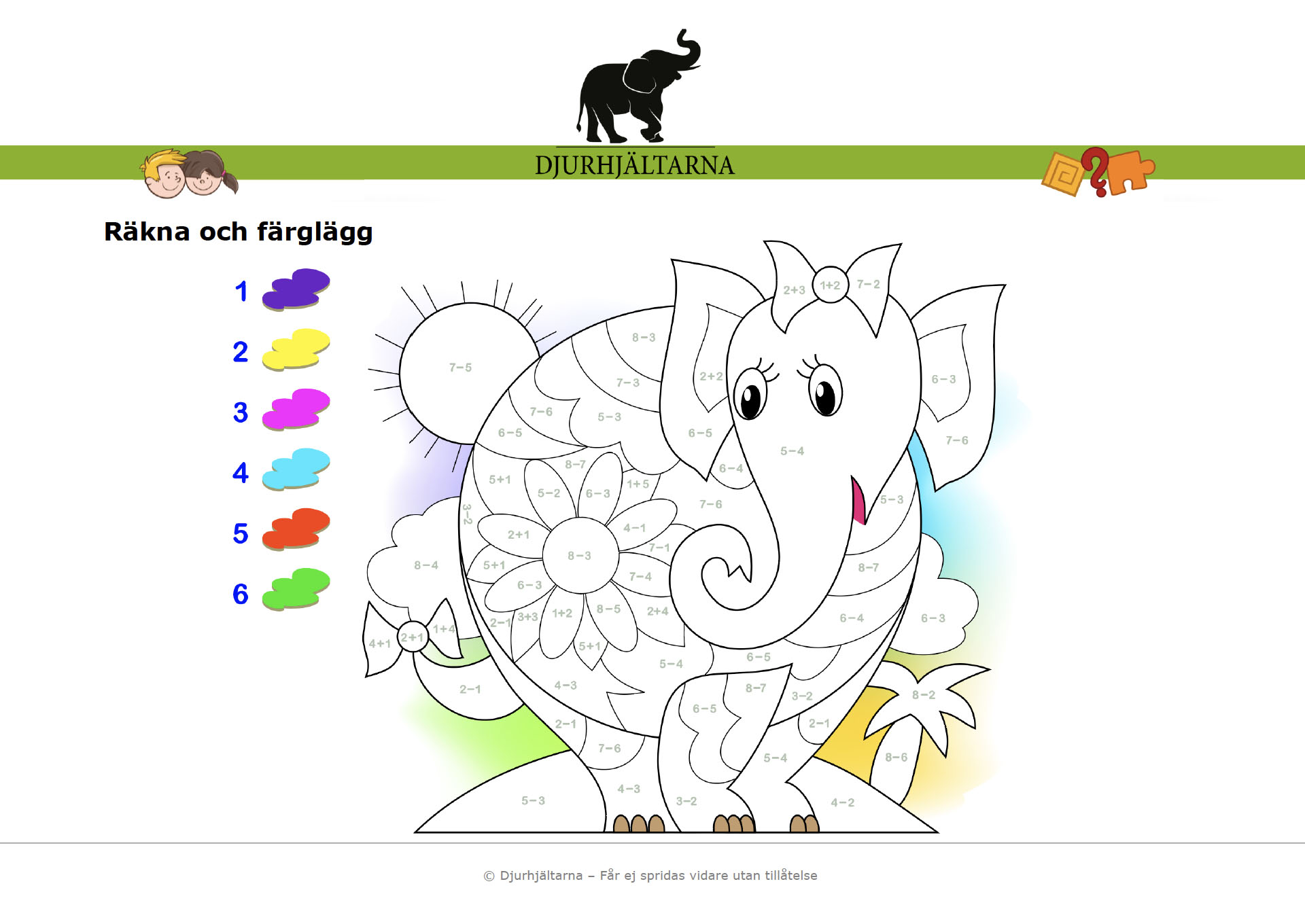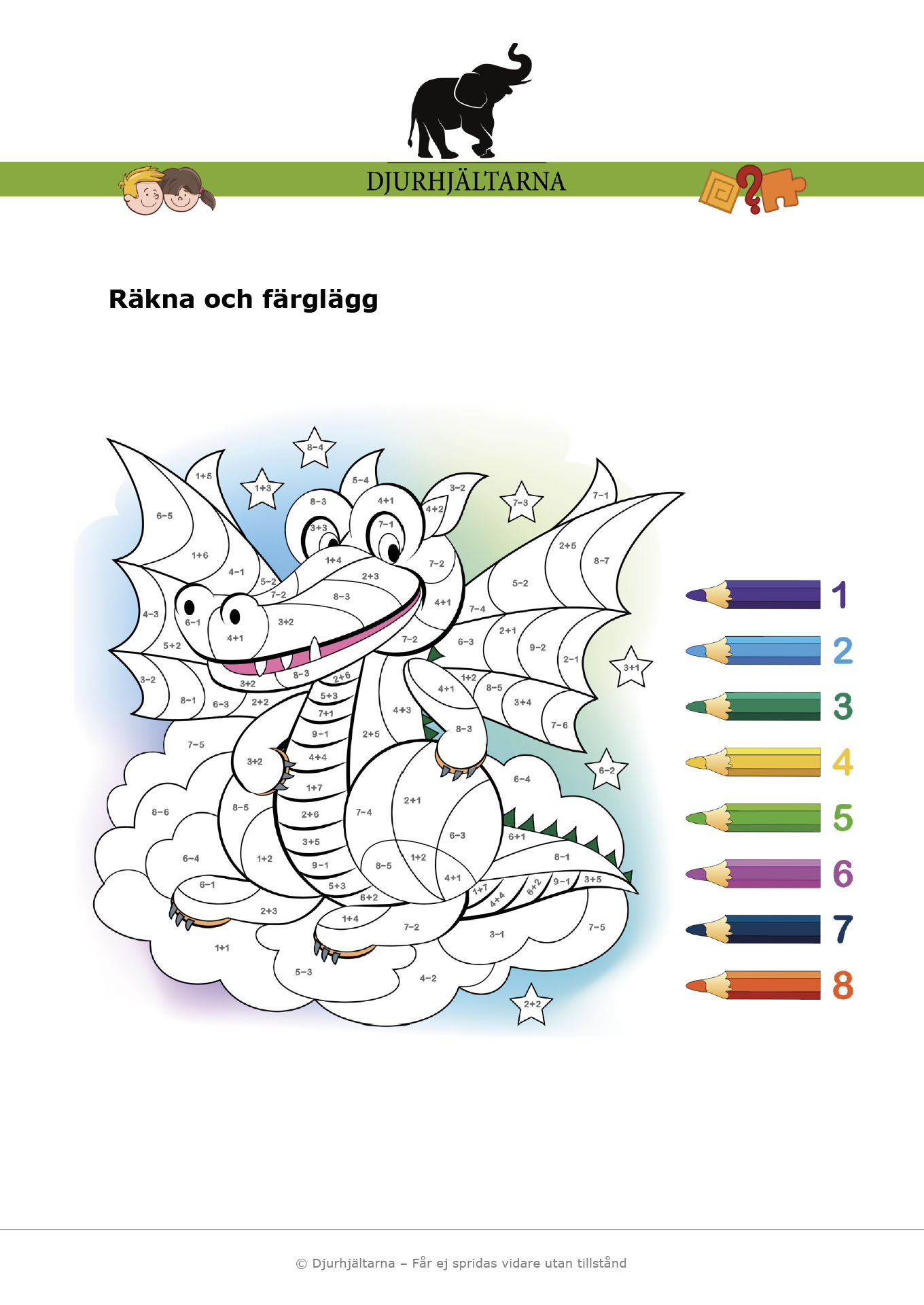 Roligt och färgglatt material där barnen/eleverna får träna på addition och subtraktion och färglägga enligt instruktion.