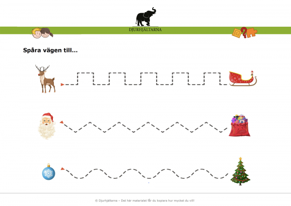 I denna övning med jultema får barnen/eleverna utveckla och förfina sin handmotorik genom att följa mönstrets väg och form mellan de olika figurerna. Detta för att underlätta för barnets skrivutveckling och formande av bokstäver.