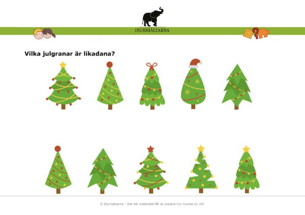 Genom denna övning får barnen/eleverna träna på att se likheter och olikheter när de letar fram vilka julgranar som är likadana!